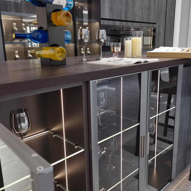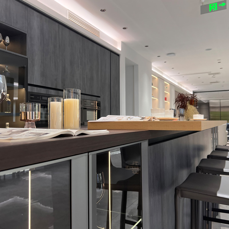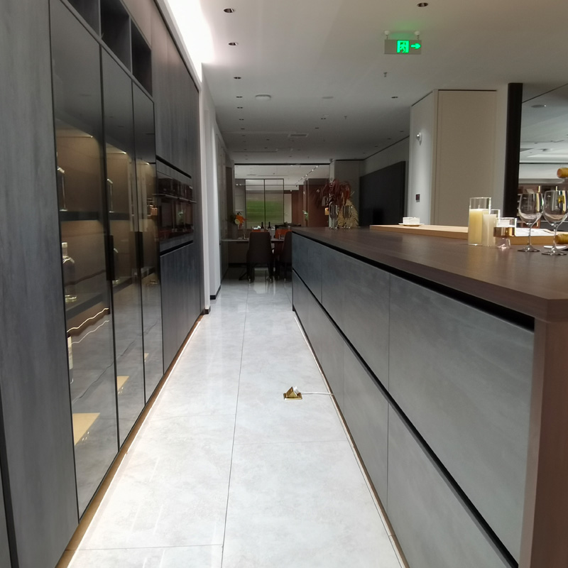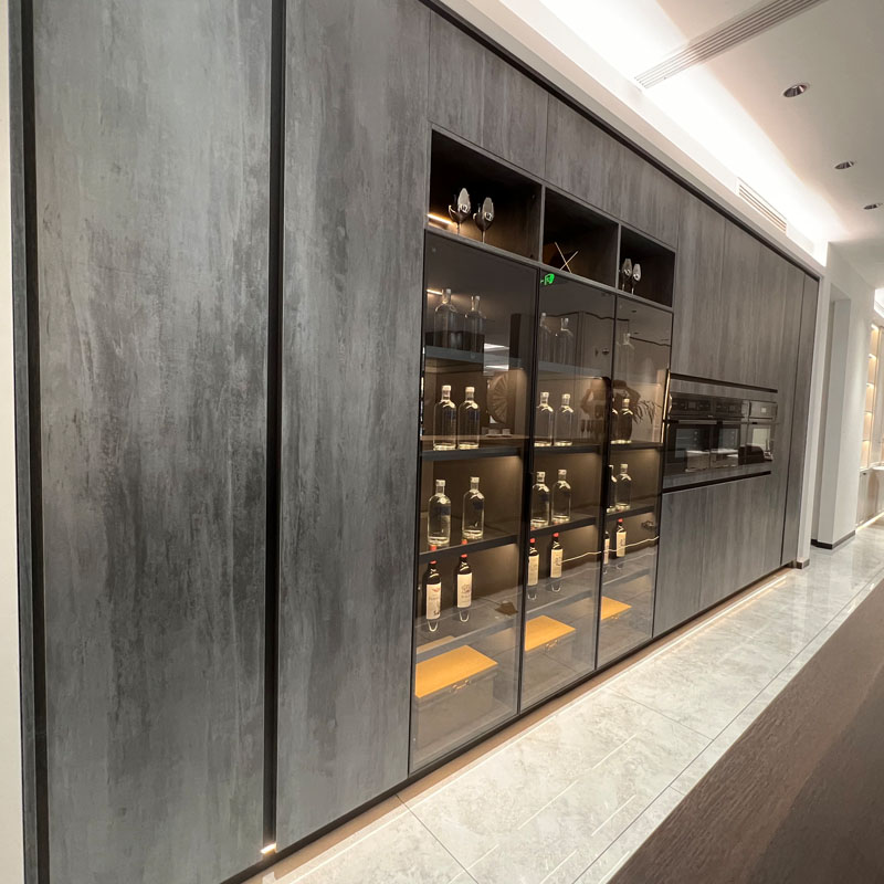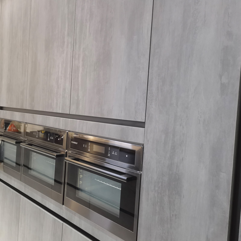Módna priemyselná laminovaná kuchynská skrinka v novom štýle so starou farebnou úpravou, ako je zvetrávanie kameňa, dotyk je hladký a kvalitný, zladený sklenený dverný panel s hliníkovým rámom vytvára vysoký zmysel kuchynského dekoru. Materiál je vodeodolný, ľahko sa čistí a štýl nie je jednoduchý.
