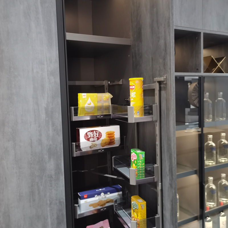 Laminovaná kuchynská skrinka v novom štýle s farebnou starou úpravou, ako je zvetrávanie kameňa, dotykový pocit je hladký a kvalitný, zladený sklenený panel dverí s hliníkovým rámom vytvára vysoký zmysel kuchynského dekoru. Materiál je vodeodolný, ľahko sa čistí a štýl nie je jednoduchý.