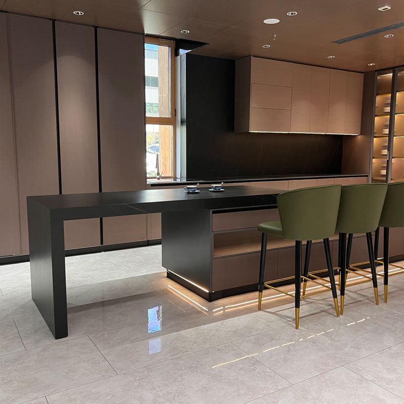 Qingdao Sinoya Co., Ltd. vám s radosťou poskytne luxusné kuchynské skrinky v tvare L so sklenenými kuchynskými skrinkami.
